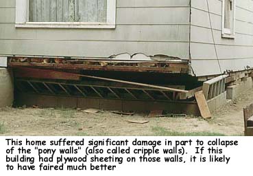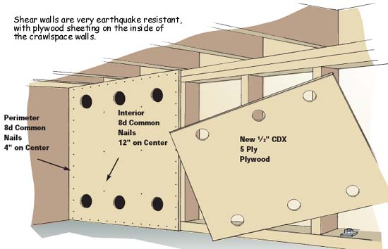 Also known as cripple walls are susceptible to collapse in an earthquake. The lateral movement when the earth starts moving can cause this kind of failure. Most homes only have diagonal wood bracing, and this is often not strong enough to resist collapse. Shear walls have plywood nailed to them as in the diagram below. |