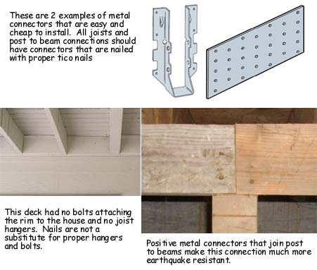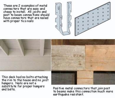 Joist Hangers A positive connection where post meet beams and where beam meet each other is usually a very simple step, it is an inexpensive fix and all connections should have them. Many structures and decks are lacking joist hangers, again, a simple and cheap fix that can save your life and help your home survive an earthquake. |