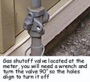 These shut offs are located at the meter. It is best to have a wrench that is tethered to the meter, so you know it is there when you need it. If you have propane the tanks have shut off valves at the lines connecting them to the home or appliance. If you ever smell a strong odor of gas (rotten egg smell) shut off the gas immediately, turn off the electricity (this can prevent explosions or fire) and open all the doors and windows. Call 911 for the fire department and the gas company to locate and isolate the gas leak. |